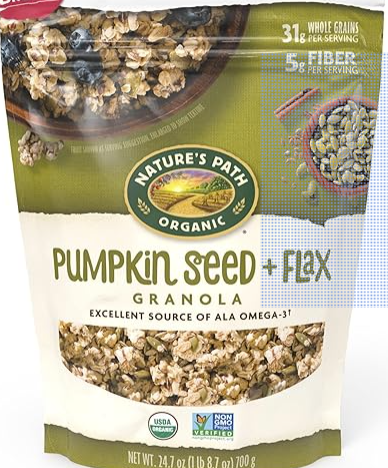 - Organic whole grain cereal:On days we eat cereal (less frequent), we switched to a better/natural cereal with granola and oats from Costco**. I also throw some nuts into it (Sunflower seeds, Pumpkin, Walnuts.. occasionally little bit of hemp seeds)
