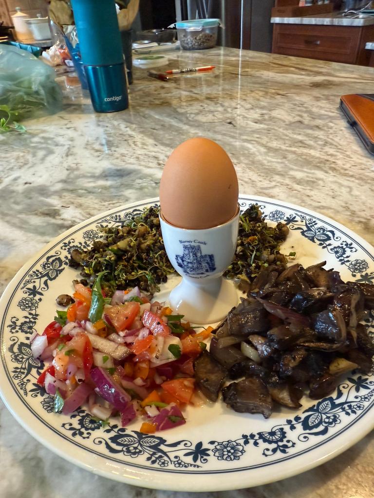 Soft boiled egg, Tomato, Onion, Parsley, EVOO, Lemon Juice, Black pepper, Oregano, Black eyed peas, Sprouts, black rice, mushroom (8 plant foods)