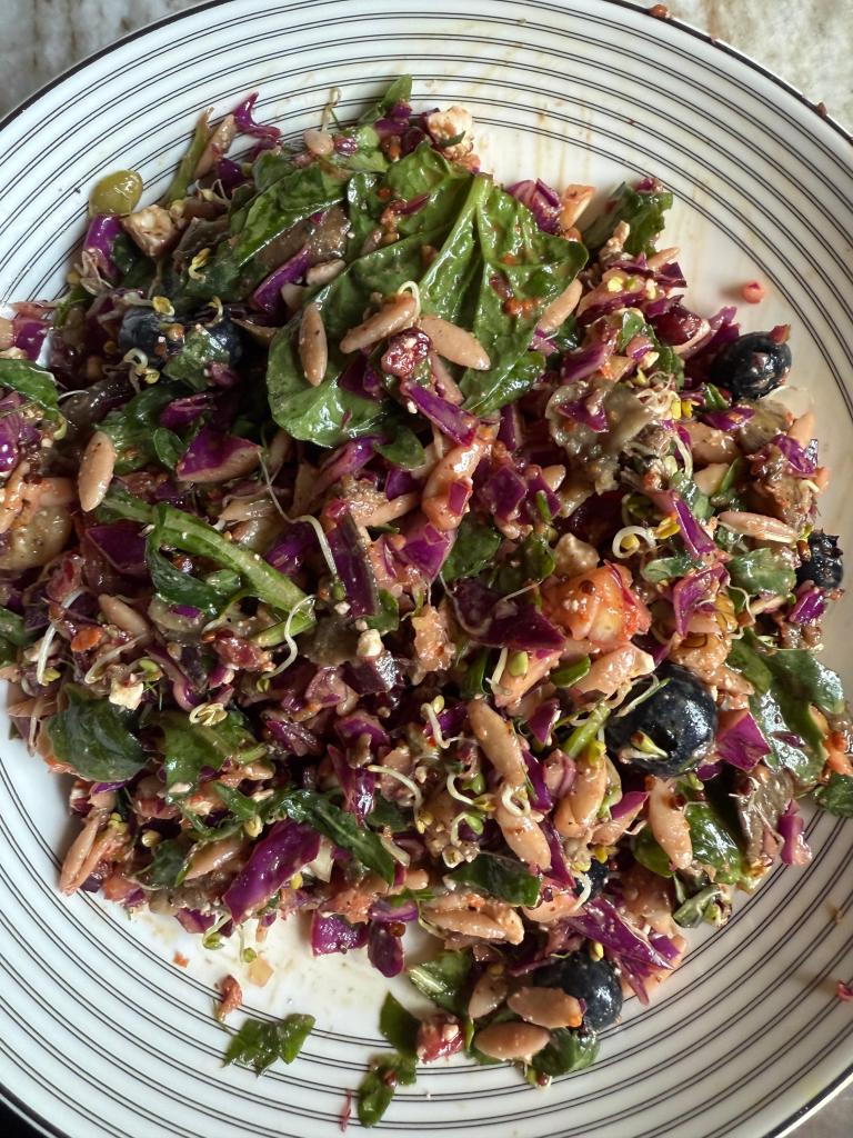 Whole grain Orzo, Red cabbage, Walnuts, SPinach, EVOO, Lemon Juice, Sprouts, Grapes (7 plant foods)