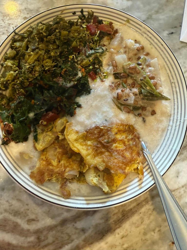 Aviyal (6), Okra & onion, Raw banana, Fermented matta rice, rasam (tomato, cilantro), eggs (pepper, onion) – (13 plant foods)