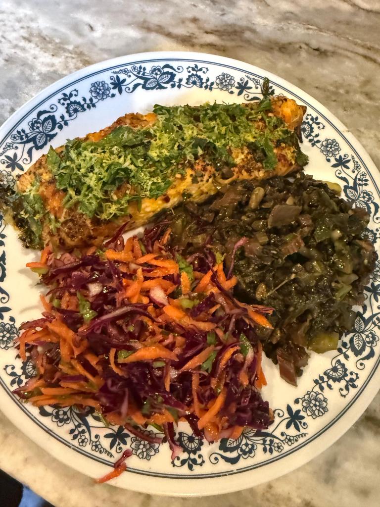 Salmon, Spices, Parsley, Parmesan Cheese, Red cabbage, Carrots, EVOO, Lemon Juice, Cilantro, Green chili, Kale, Celery, Onion (9 plant foods)