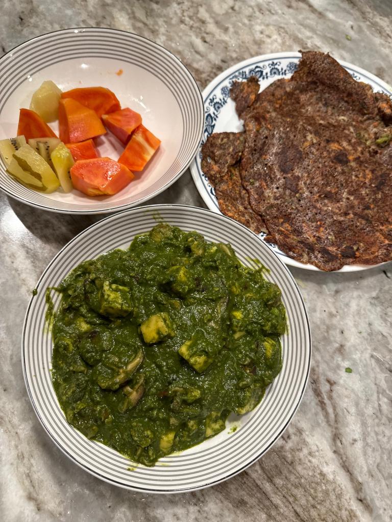 Paneer, Spinach, Onion, Green chili, Cumin, Coriander powder, Papaya, Kiwi, Millet, Onion, lentils (10 plant foods)